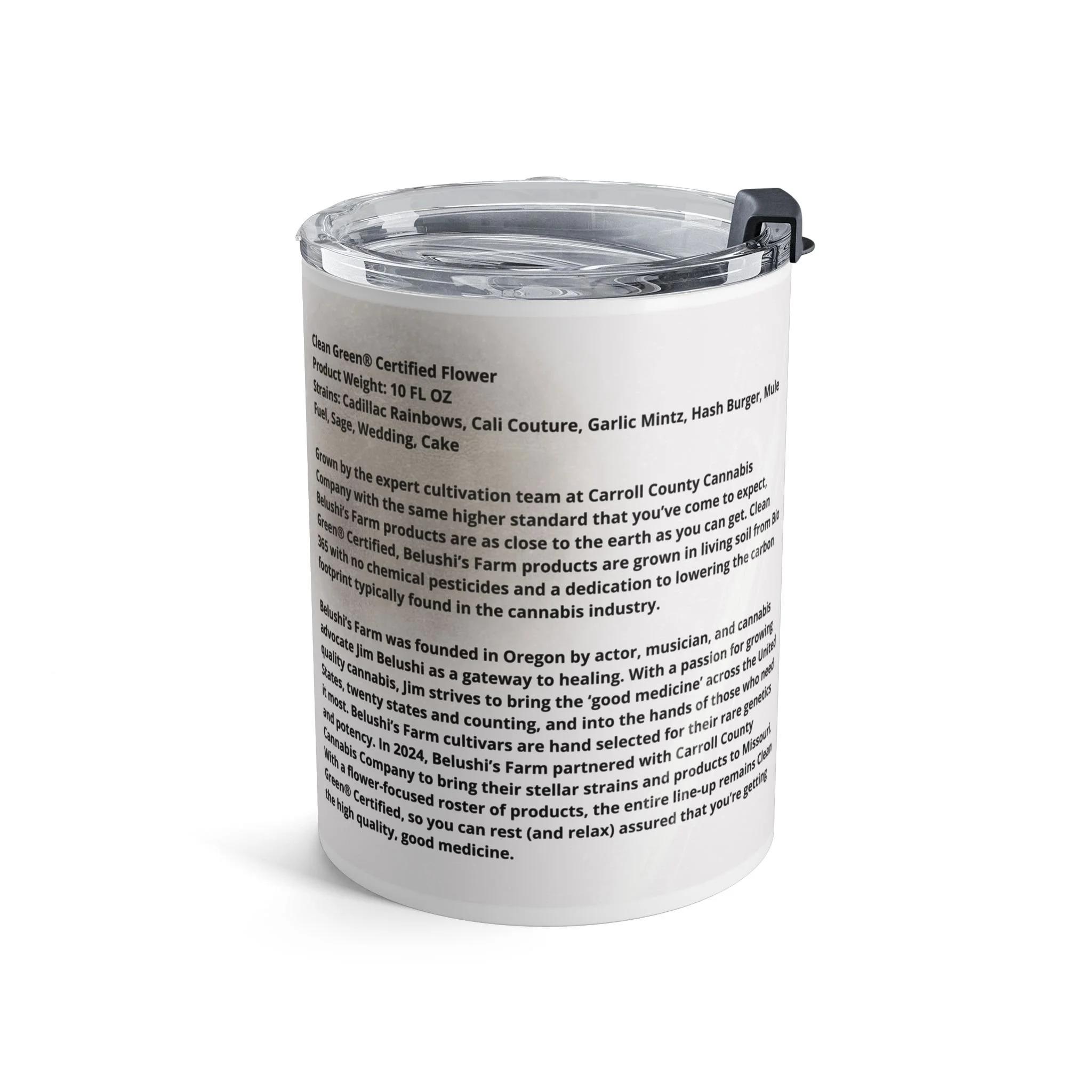 Pop that top and fill it up. A nod to our iconic, biodegradable pop-top eighth containers, the Pop-Top Tumbler from Carroll County Cannabis Company is a clever way to stay hydrated throughout your day. This stainless, 10oz tumbler is vacuum-insulated and built to last. It's perfect for showing off your love for your favorite our coveted Belushi's Farm brand...on the road, at work, or in the back country. Image contains a parody image of our Belushi's Farm eighth packaging, complete with smudges on the outside from wear and tear, and company bio in lieu of typical the COA label.